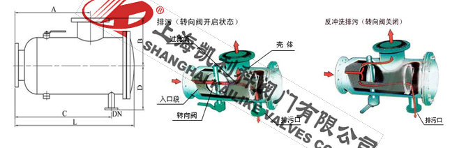 手動蝶閥關閉,即閥板平面與筒體軸線垂直,(此時扳手旋轉90度與筒體軸線垂直),開啟排污閥,此時水流從進口進入過濾網筒前端,因蝶閥關閉,水流被閥板擋住,只能從前端網孔進入濾筒外側,大部分從出口流出,而由于排污口打開,濾筒后段水排出后壓力降低,故一部分水又從過濾器后段的網孔反沖入網筒內,從而達到從濾網外部沖洗粘附在網